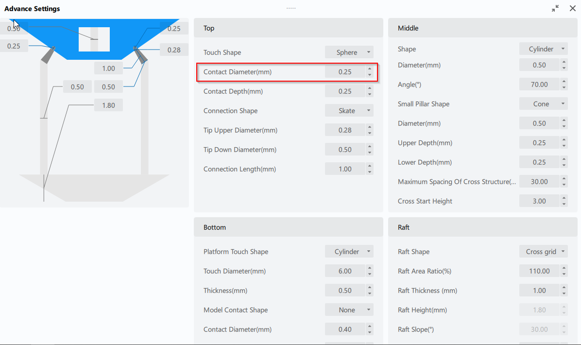 - چسبندگی بیش از حد ساپورت: اگر ساپورتها به شدت به مدل چسبیدهاند، میتوانید فاصله Contact Diameter را افزایش دهید.